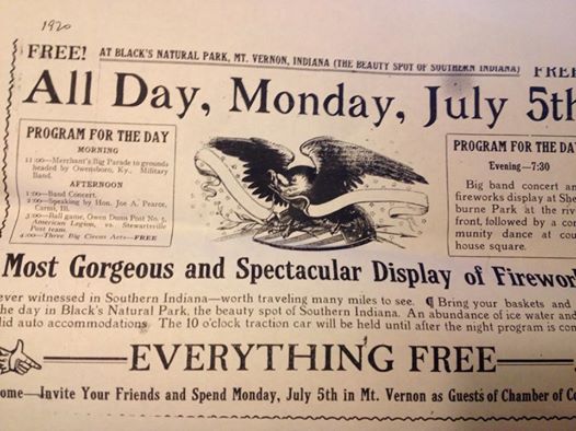 Thomas Underwood, a citizen who witnessed the dedication of the Soldiers and Sailors monument on the Court House lawn in 1908, looked at pictures of a "Progress Edition" of the Mt. Vernon Democrat and was filled with nostalgia. As he looked at a photo of Sherburne Park, a place he saw constructed he remembered band concerts, the joyful laughter of children at play on slides and in swings. He saw through his mind's eye the peaceful calm of a moonlight Ohio River and the farmstead lights shining over the trees on the Kentucky shore. He could see once again river packets, excursion steamers and "glittering showboats" tied up at the levee. "The shrill 9 P.M. curfew blasts of the steam whistle from the waterworks echoes across the decades. He was proud of our past and hopeful for the future.