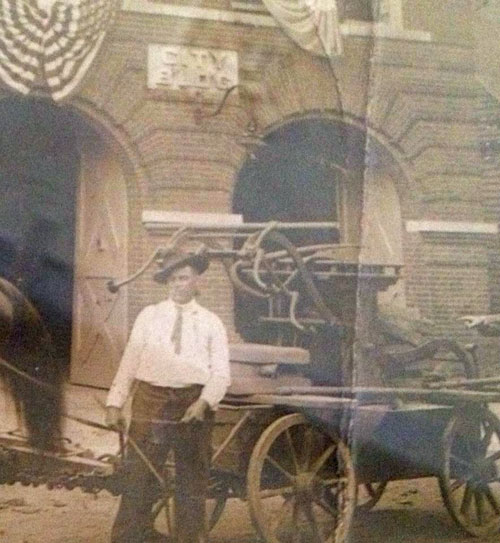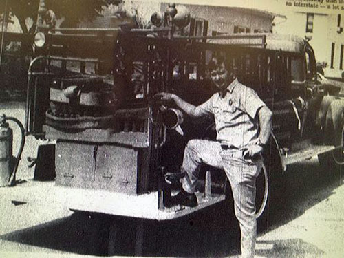 Bob York in 1973 stands by "Little 4" a truck that was at the department since 1934. The bed was on the city's original piece of motorized equipment, a 1918 Republic truck.