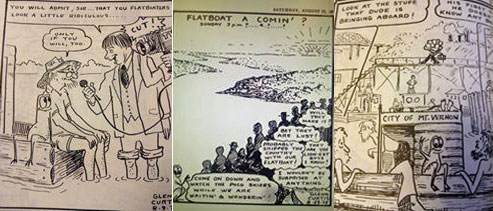 For at least 4 years in the mid 1970's the "City of Mt. Vernon" participated with other river communities in the Great Ohio River Flatboat Race. Gonna go back to 1975-1976 and through some of Glenn Curtis' cartoons capture some of the flavor. "The Spirit of MV" was voted the most authentic boat by captains of the other vessels. It started in Owensboro and ended in Henderson, Ky., as I recall.
