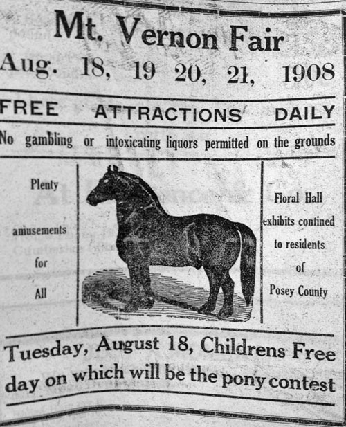 In 1837 there was a triple Owen wedding in New Harmony where six white horses drove the brides and grooms in three carriages. Some other notable horses of the 19th century was "Old Fly" the 38 year old Civil War horse of George Barrett whose horse's bones now are in the Workingman's Institute. Robert Dale Owen had three horses named "Massadonia", "Fire Fly" and "Polly Fox." Richard Owen brought home from the Civil War his saddle horse "Blue Buck." Alfred Ribeyre, "The Corn King" of New Harmony had a favorite horse named 'Gipsey Girl." A horse by the name of "Black Bess" appeared on the New Harmony stage in 1868 with a naked women on his back in a Byron play called 'Mazeppa."