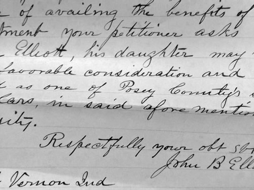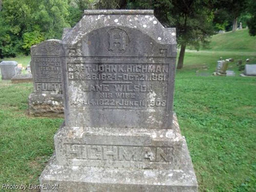At Maple Hill Cemetery in New Harmony lies John Kell Highman, the first Posey County soldier killed in the Civil War. He died at age 37 a captain in the Union Army. He left behind a wife and soon to be his ninth child to fight. How awful it must have been to leave his log home on the bluff bank of Rush Creek. His home life had been happy and contented one. With a heavy heart and many talks with his wife Jane he arranged his affairs and in April of 1861 he went for Cavalry training at the Salt Wells in Evansville. The cavalry of Posey men was composed of 84 men and rode in a parade in town. They trained with wooden sabers and one is said to be at the New Harmony Workingmen's Institute. When they left for war each soldier was presented with a silk pin cushion prepared by young ladies. Highman did not have a real good education, but he was well read on general subjects and was recognized by neighbors for his mental brightness and that made him a leader. His writing was very legible and he used a quill pen, always shaping a new one for each long entry written. He was a man of faith of the Presbyterian Church and had been married since 1845. When drill was over in Evansville the men organized and left for St. Louis on July 15, 1861. The battle of Fredericktown was fought on October 15, 1861 and the first news of telegraph came to the St. Louis Republican newspaper and among the dead was Captain Highman. The genial and warmhearted father was no more. The Evansville Journal of October 23rd said, "Capt. Highman is a native of Posey County who left his family and business to serve his country upon the tented field. He was a brave soldier and a good citizen and his loss will be mourned by his numerous friends in Southern Indiana." The Mt. Vernon South Western Advocate paper said on November 1: "We were unable to be present at the burial of Capt. Highman which took place at New Harmony, but understood the occasion was one of peculiar interest. The procession, which accompanied the remains of the gallant deceased to the grave, being the largest witnessed in the county and the burial ceremonies performed being imposing and impressing. The number present is variously estimated at from two to three thousand. The delegation from this place was large, embracing all of our military companies under command of Col. James. There were five companies present, the Artillery, Cavalry and three Infantry companies. Capt. Hinch Commanding the Cavalry and Capt. Larkin the Mt. Vernon Guards." It was said that as the last carriage left the house, the head of the funeral procession was at the cemetery, a distance of four miles. The New Harmony Grand Army of the Republic Post was named after him. When his wife died in 1903 at age 81, she never remarried. Col. Julian Dale Owen, who attended in command of the Calvary escort, had performed the same service for her husband 40 years before and had accompanied his body from Fredericktown, Missouri.