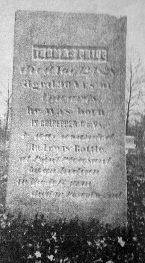 Thomas Price was a soldier in Col. Charles Lowe's regiment on October 10, 1874 and was wounded in his left arm by an Indian that left it almost useless. In battle he carried an old Deckard rifle and powder horn of which were still in existence in 1932 and were then according to a book in possession of the Murphy Museum in New Harmony. The rifle barrel was long and small bored and the stock was of silver bands and plates. The powder horn was covered with etchings of the likes of crocodiles, Indian heads, an eagle, a sun and a moon. The tombstone is in the Bethsaida Christian Church Cemetery. The inscription says: "Thomas Price. Died November 12, 1828 aged 90 years or upward. He was born in Culpepper Co. Va., & wounded in Lewis Battle at Point Pleasant by an Indian in the left arm. Died in Posey Co. Ind."